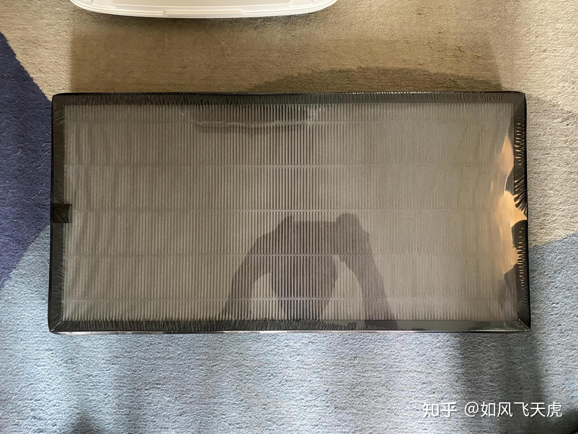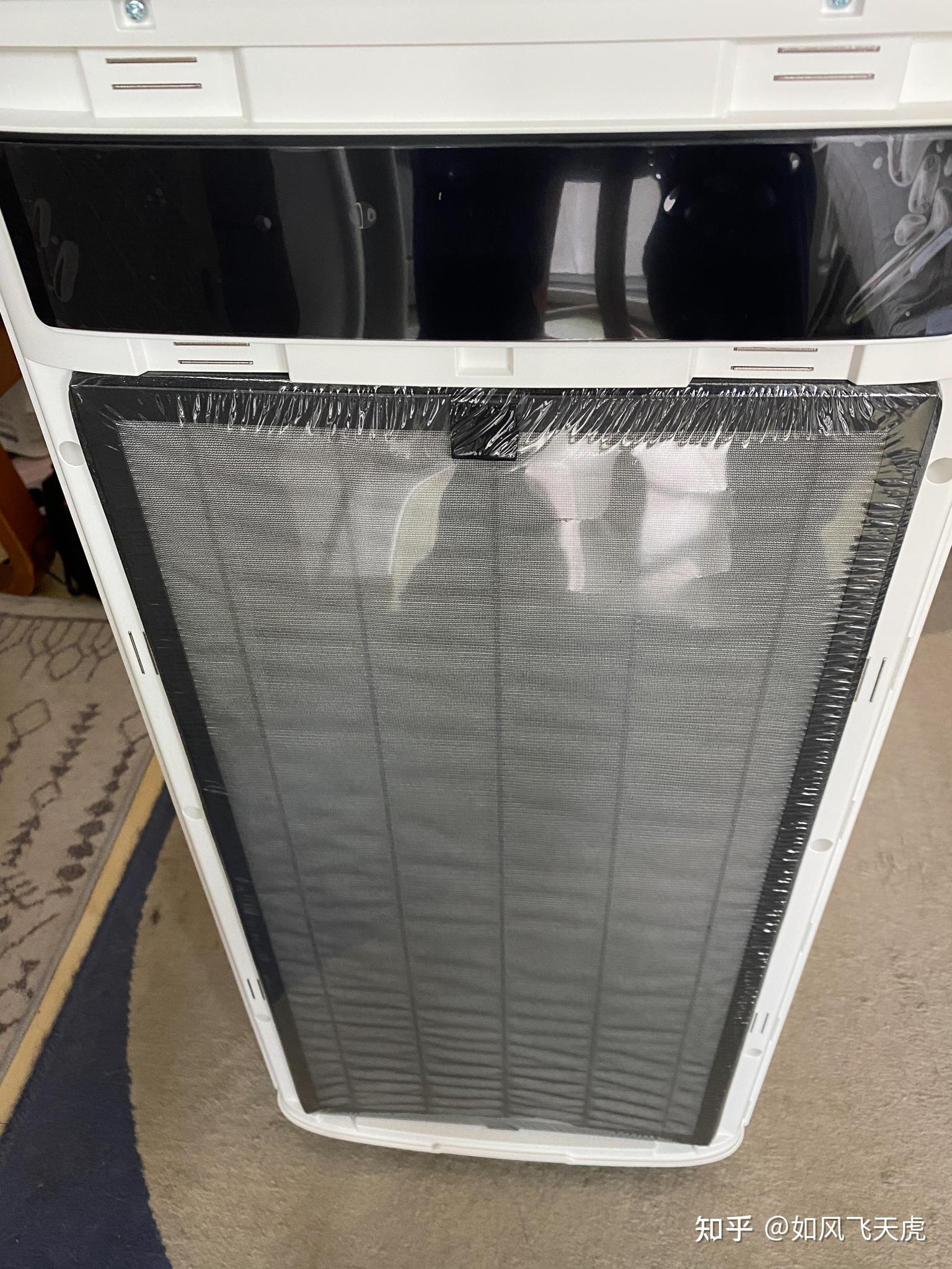 拉開前面板,果真外面是厚厚的一片濾網,有著塑封,可以確保嶄新的濾網不被污染,同時可以確認是新的濾網。