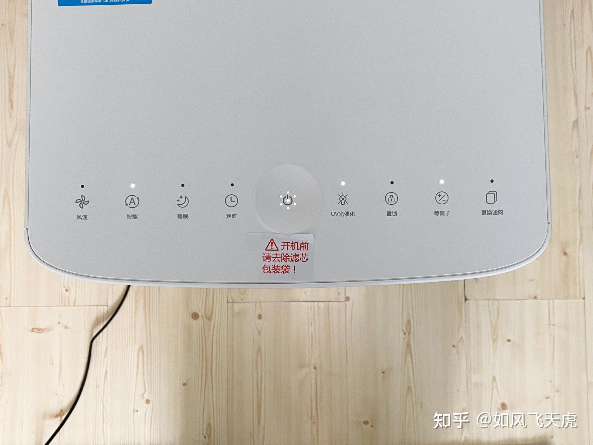 我們看下這個頂部的按鈕和顯示燈,正中一個大的圓形按鈕是開關,左右各有四個觸摸按鈕和相對應的指示燈。從左到右區分是風速、智能、睡眠、定時、UV光催化、童鎖、等離子、改換濾網。