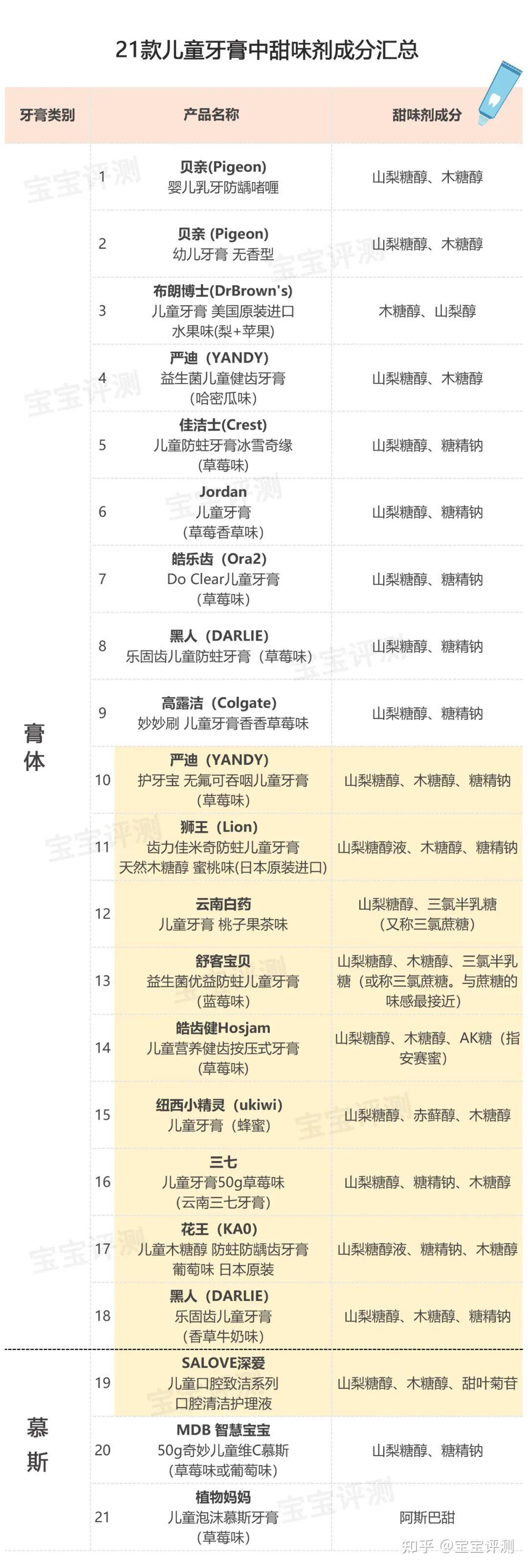 但思索到牙膏中這些甜味劑成分的添加量未知且沒有規則限量,加上甜味劑太甜被寶寶吞咽的能夠性更大,笨爸爸更建議選擇甜味劑添加種類較少的,以山梨糖醇和木糖醇這兩種平安性更高的甜味劑的兒童牙膏。