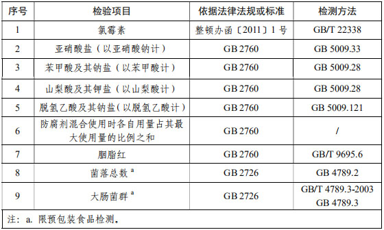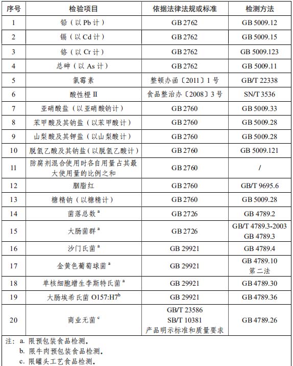 GB 2760 食品安全國家標準 食品添加劑使用標準 GB 2762 食品安全國家標準 食品中污染物限量 GB 4789.2 食品安全國家標準 食品微生物學檢驗 菌落總數測定 GB 4789.3 食品安全國家標準 食品微生物學檢驗 大腸菌群計數 GB/T 4789.3 -2003 食品衛生微生物學檢驗 大腸菌群測定 GB 4789.4 食品安全國家標準 食品微生物學檢驗 沙門氏菌檢驗 GB 4789.10 食品安全國家標準 食品微生物學檢驗 金黃色葡萄球菌檢驗 GB 4789.26 食品安全國家標準 食品微生物學檢驗 商業無菌檢驗 GB 4789.30 食品安全國家標準 食品微生物學檢驗 單核細胞增生李斯特氏菌檢驗 GB 4789.36 食品安全國家標準 食品微生物學檢驗 大腸埃希氏菌 O157:H7/NM 檢驗 GB 5009.11 食品安全國家標準 食品中總砷及無機砷的測定 GB 5009.12 食品安全國家標準 食品中鉛的測定 GB 5009.15 食品安全國家標準 食品中鎘的測定 GB 5009.27 食品安全國家標準 食品中苯并(a)芘的測定 GB 5009.28 食品安全國家標準 食品中苯甲酸、山梨酸和糖精鈉的測定 GB 5009.33 食品安全國家標準 食品中亞硝酸鹽與硝酸鹽的測定 GB 5009.121 食品安全國家標準 食品中脫氫乙酸的測定 GB 5009.123 食品安全國家標準 食品中鉻的測定 GB/T 9695.6 肉制品 胭脂紅著色劑測定 GB/T 22338 動物源性食品中氯霉素類藥物殘留量測定 GB/T 23586 醬鹵肉制品 GB 29921 食品安全國家標準 食品中致病菌限量 SB/T 10381 真空軟包裝鹵肉制品 SN/T 3536 出口食品中酸性橙 II 號的檢測方法
