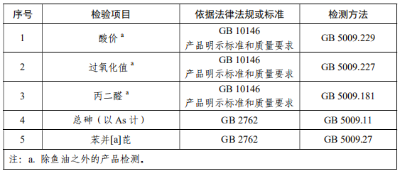 GB 5009.11 食品安全國家標準 食品中總砷及無機砷的測定 GB 5009.27 食品安全國家標準 食品中苯并(a)芘的測定 GB 5009.181 食品安全國家標準 食品中丙二醛的測定 GB 5009.227 食品安全國家標準 食品中過氧化值的測定 GB 5009.229 食品安全國家標準 食品中酸價的測定 GB 10146 食品安全國家標準 食用動物油脂 GB/T 8937 食用豬油 SC/T 3502 魚油